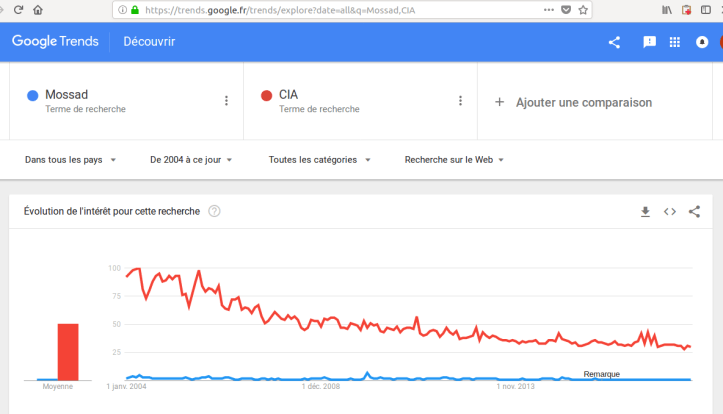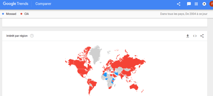 Who matters the most esp. for the Middle East where (countries in blue on second map) people actually google more in absolute terms the Mossad than the CIA ? What’s the biggest agency, with the most money and most scandals ?