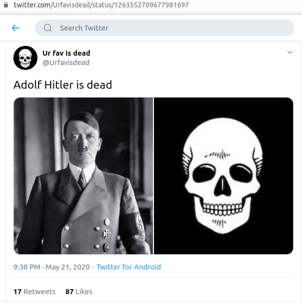 Some social media accounts (in the youth, the videogame movement for instance, many teenagers have a cult of Hitler…) reported the news of his actual death…