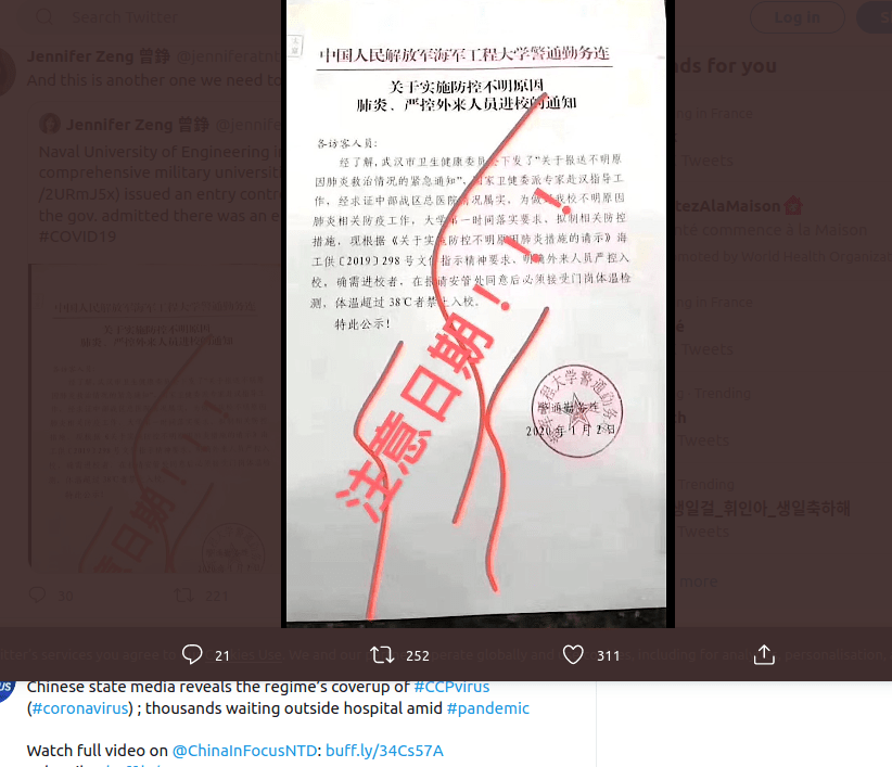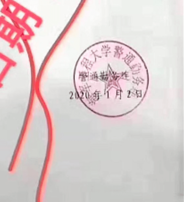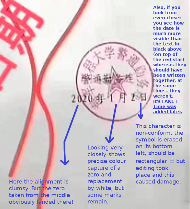 Looking at a notice of closure for a People’s Liberation Army Navy university shows also signs of falsification, the timestamp is false, the character for “day” (ri, 日) is broken, the spaces are too important, there is a zero that has been softly taken out… it’s too bold vs. the line above. Three images below, full pic, the unedited zoom onto the stamp and my comments on the third pic. Antedating to cover the fact that the virus was released to kill the rebel group.
