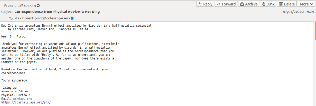 Then two days later I sent to PRX my “reply” to the article (TEMPID: es2020jan03_724 RECVD: Fri Jan 03 21:36:17 2020 TITLE: Reply: Intrinsic anomalous Nernst effect amplified by disorder in a half-metallic semimetal)