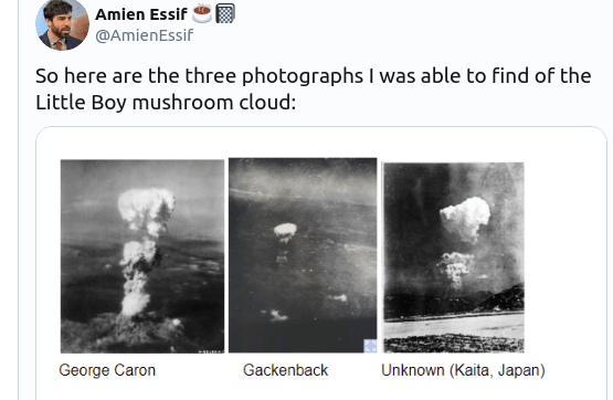 The first and the last image in particular show the division in two of the event. The “bubble” on the middle-right is the remain of the high-altitude blast, from Little Boy itself, at 500 meters of altitude, it triggered the blast, on the ground, of the plutogenic nuclear reactor that was in that city, it’s the cloud rising from the ground on the left, much more denser ! lots of uranium 238, a natural-uranium reactor of course for plutonium production so it’s a dense, dirty cloud rising. That reactor exploded, but it’s a very small explosion, mostly a fire, like what happened in Beirut one month ago. When the reactor explodes the burst and thermal effect of Little Boy is already mostly done, by the time the photograph has been able to turn back his neck and look at the event its shockwave is over, of course… he sees the cloud of the reactor explosion & fire rising & meeting the remains of Little Boy, that’s what he captures with his photograph, the big dense cloud from the plutogenic reactor and the thin remains of the explosion of Little Boy !