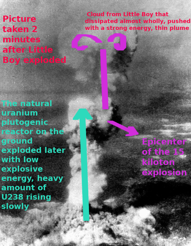 The cloud of the explosion leads to identify two sub-events ; firstly, the detonation of the nuke, at 500 meters of altitude as was set by the engineers on the altimeter of the device ; and then, that altitude blast that devastates the city triggers the explosion of a small plutogenic nuclear reactor on the soil, that plutogenic nuclear reactor explodes and its uranium 238-rich cloud rises, with hence much more smoke – the unfissionned U238. Let me use the pictures from the Deutsche Welle journalist that recently investigated the issue of the use of bad pictures for the Hiroshima & Nagasaki explosions, Amien Essif :