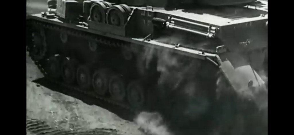 Indeed: the Nazi bombs during that battle achieved significantly lower temperatures. Even though the initial explosivity is quite good, there is no real fireball. The bombs create an area destruction. The clouds are semi heavy, consequence of the large amount of unplutogenized u238 in them. Soviet bombs (clean – there are some uranium gulags but no crematory ovens or similar things on the Soviet side then, as what RBMKs in particular will serve for later) create an ignition that is more powerful, burning intensely the dust, so the cloud rises very rapidly. Of course very white clouds. I’m not really showing Soviet bombs here. Just the aftereffect on a tank burning inside. The movie also shows that one zyklon B bomb hit one Soviet tank without damaging it…