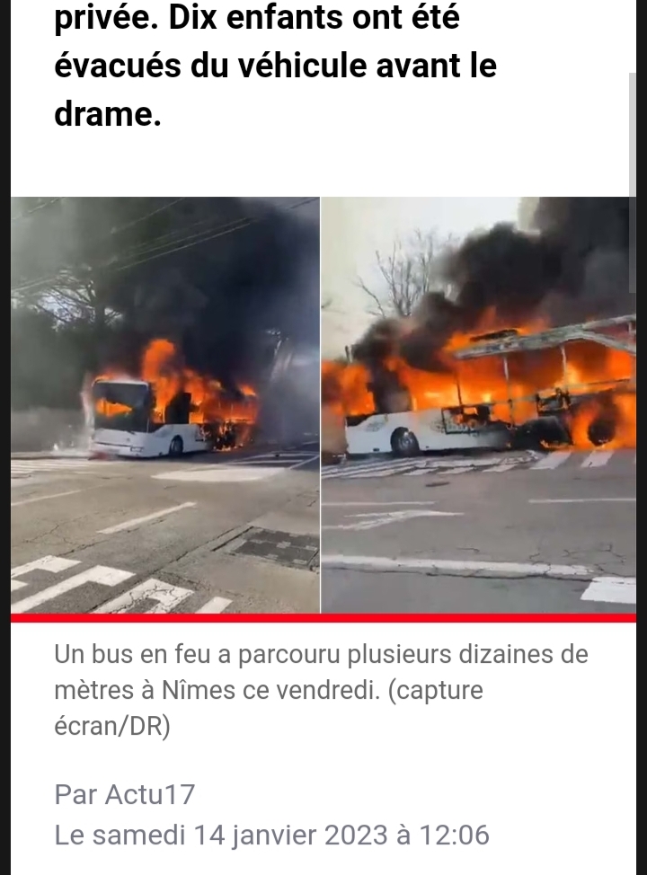 You’ll learn in the news that a bus took fire in Nîmes yesterday and it’s clearly a zyklon-C propulsion that took fire. The bus advanced fast while on fire, like a torch, confirming the zyklon-C propulsion along with the substance of the plume.