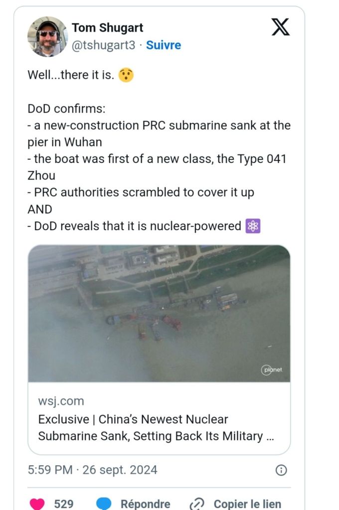 There are indications (confirmed by the Elysée) that the Type 041 submarine in Wuhan was hit by a zyklon railgun strike.