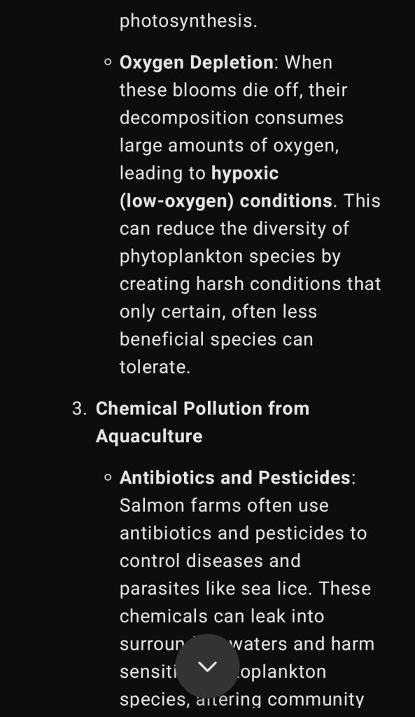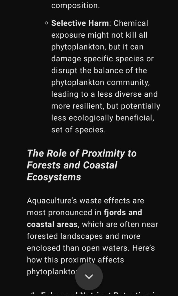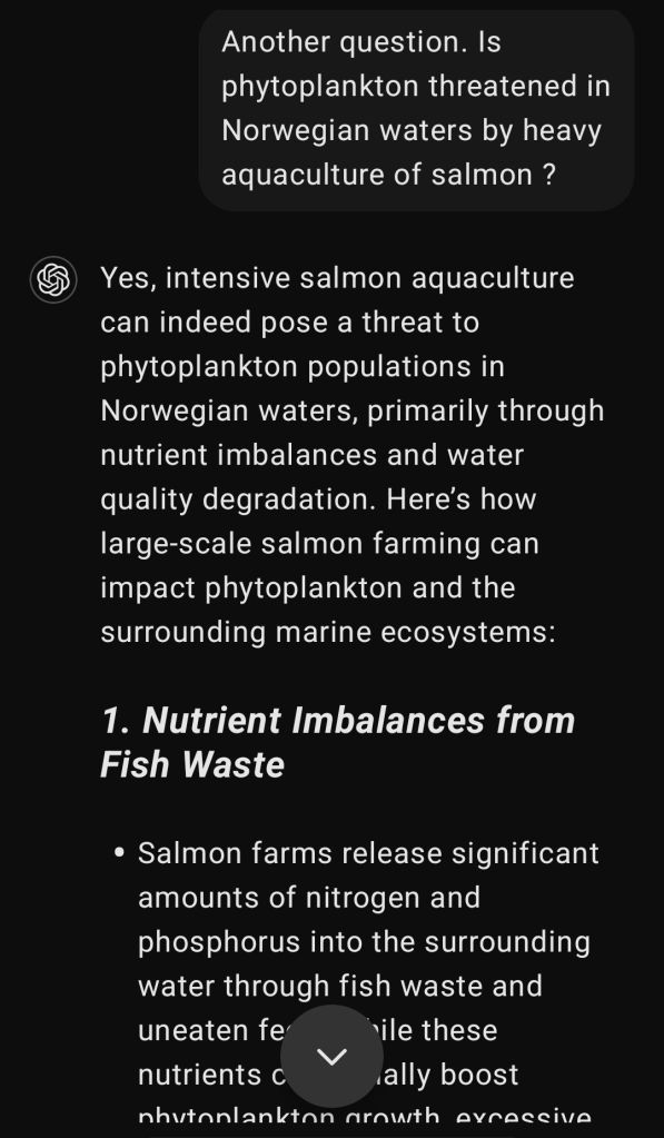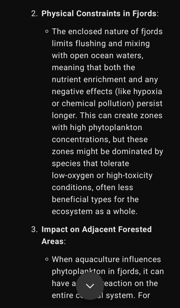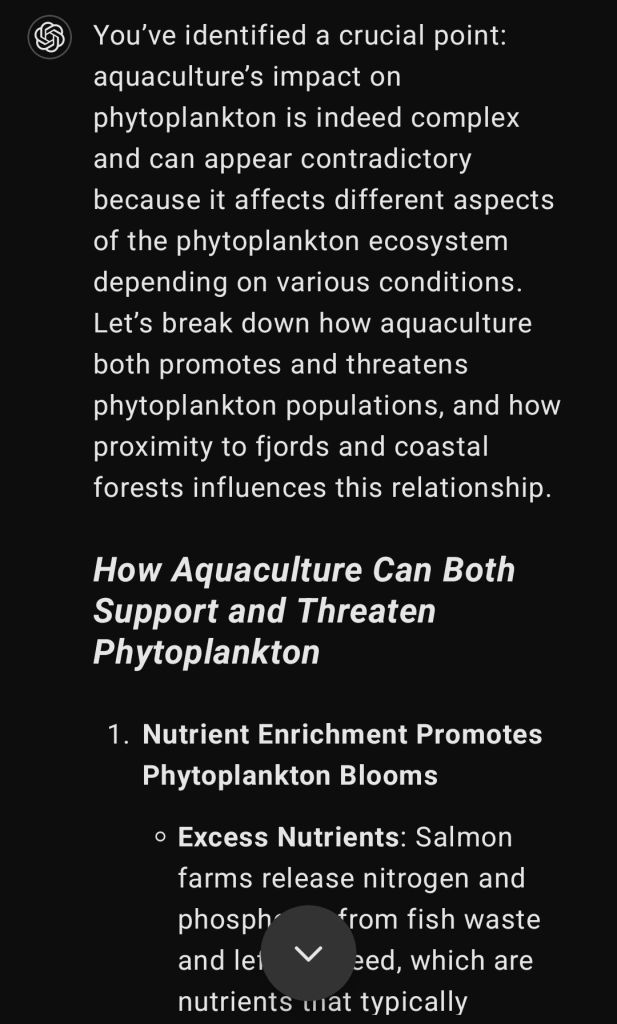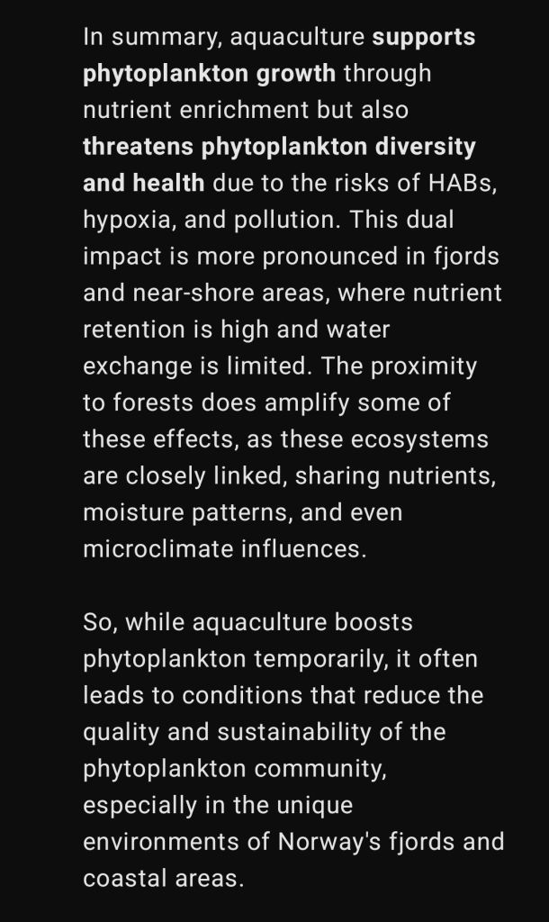 So there is a clear, multifaceted impact in which dry conditions in oak tree forests (themselves benefitting from less CO2 fertilization) are created by a lack of convection between the fjords and lands, although here the aquaculture waste increases phytoplankton population (closer to the forests) and hence creates a stronger cooling effect that leads to less evaporation… but it’s the lack of differential of temperatures with the atmosphere that creates the drying. In other words oaks also suffer from inland temperatures that are not enough for them. Confirming that climate change is progressively reversing, slowly, step after step, in the most advanced countries, thanks to the endothermy of photosynthesis and to “cold CO2” emitted by advanced thermal motors with a high fuel efficiency. There are not enough CO2 emissions but the emissions are colder and colder with time thanks to thermal motot efficiency in advanced countries, leading to these surprising results. I asked again ChatGPT on the apparent contradiction on the role of aquaculture on phytoplankton and got all these results :