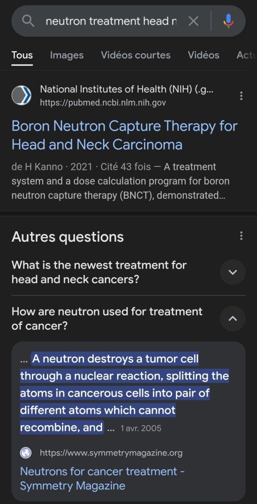 In my opinion direct treatment with phytocannabinoids is more relevant than chemo and even radiation therapy, albeit neutron therapy can play a good role. Alpha emitting nanoparticulates from internal contamination have to be eliminated. Their excretion is a necessary complement to phytocannabinoid treatment to ensure that the cancer doesn’t come back. Neutron therapy can help by transmutating the shuriken (fertile) alpha emitters before excretion (made much more easier as they become round) or fission.