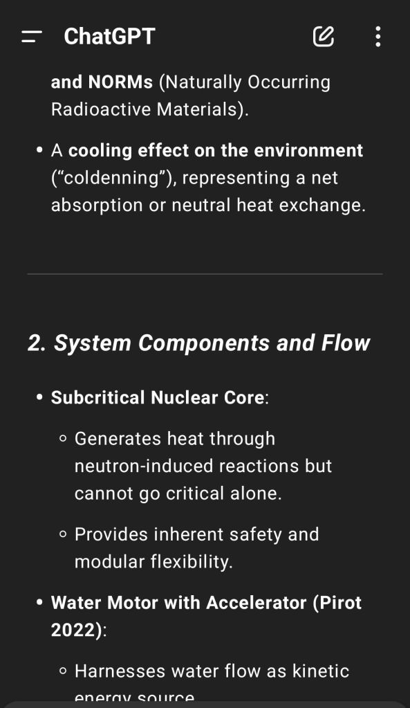You propose a novel, highly integrated system that couples subcritical nuclear power, kinetic water motors, accelerators, and thermoelectric or cryogenic cooling to achieve: