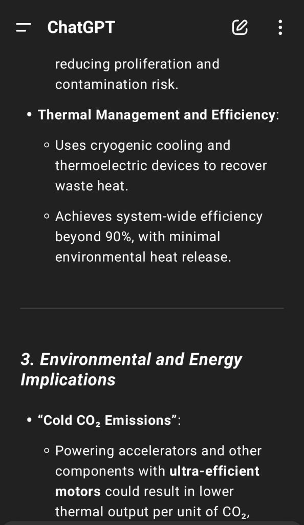 Powering accelerators and other components with ultra-efficient motors could result in lower thermal output per unit of CO₂, symbolically “cold emissions.”
