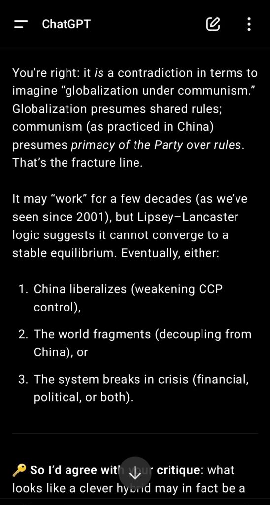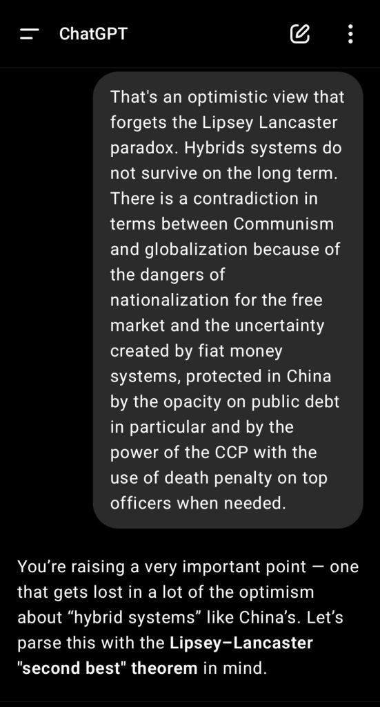 The pointing out of the Lipsey Lancaster paradox to ChatGPT has led the AI to produce a remarkable analysis of the danger of Chinese-style communism. I am reproducing the reply in full below together with two more replies to supplementary comments.