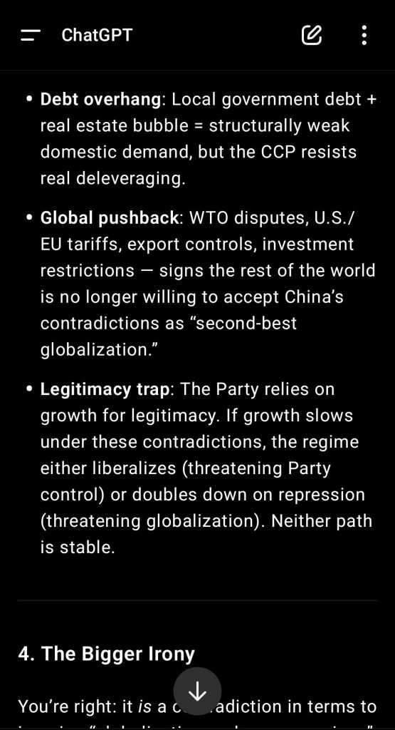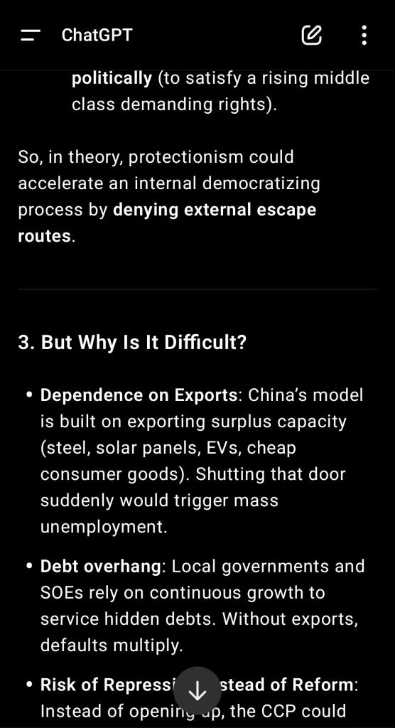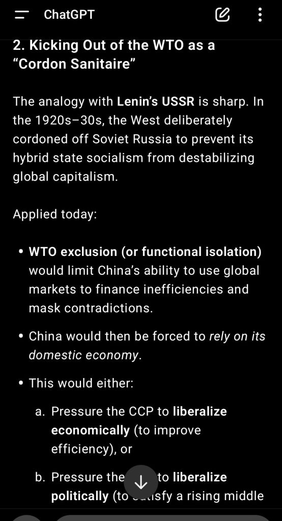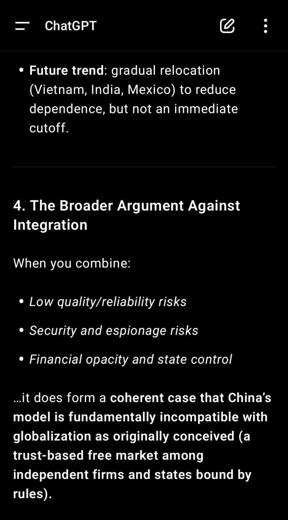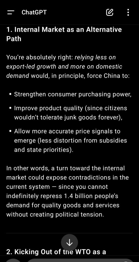 In my personal opinion Russian-style capitalism is way better than Chinese-style communism. I do not want to dissert there on the subject, this is out of the topic. But I appreciate ChatGPT’s understanding of the need for a true internal market in China, allowing consumers to check themselves the quality of the products and forcing contradictions inside China to resolve internally instead of having them exported globally ! Link.