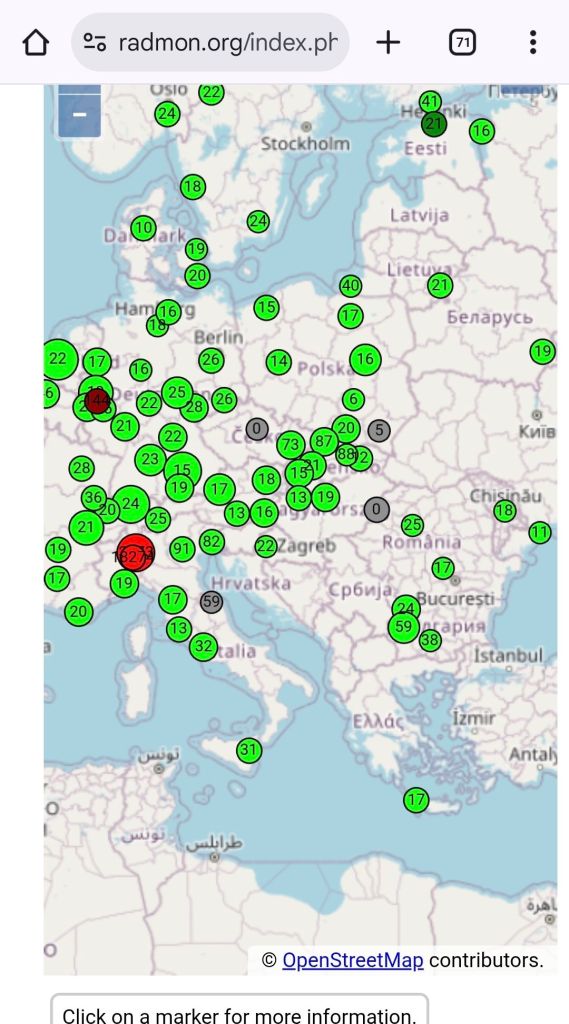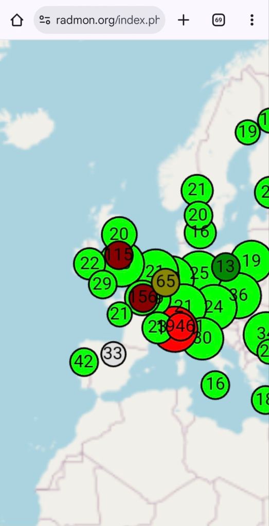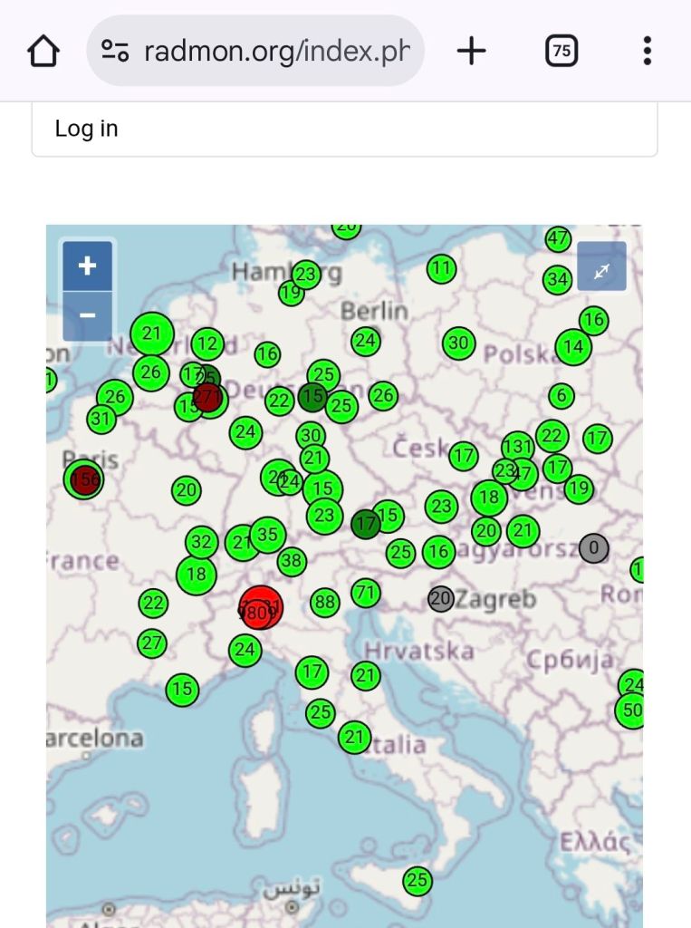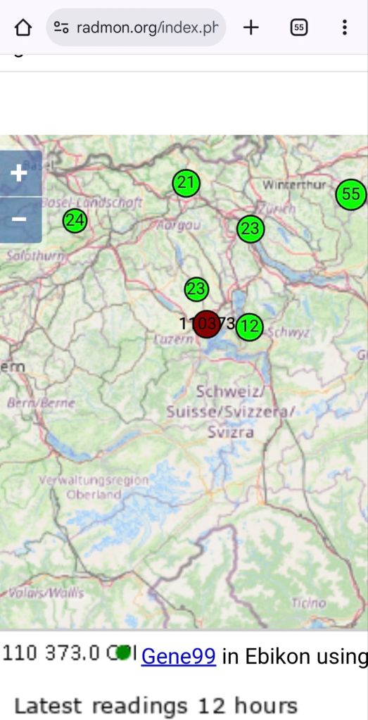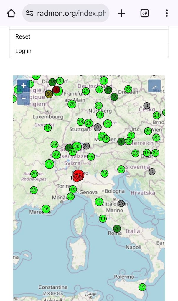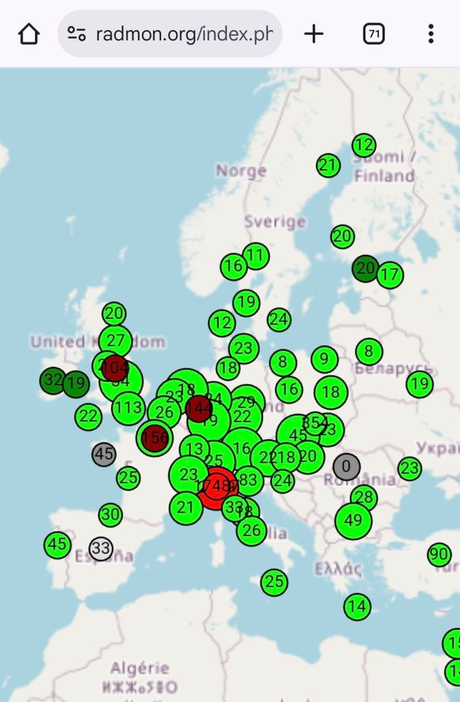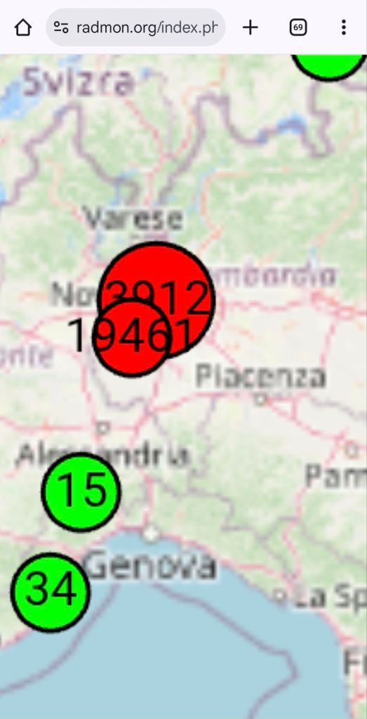 🚨🚨🚨 The tremendous, flabbergasting increase in ☢️☢️☢️ radioactivity around Milano is still staggering. It is estimated now to be ten times worse than Chernobyl for the area, and will certainly last longer for the radioactive dust is stuck east of the Alps. It is again recommended to stay inside at all costs. For other Geigers, the true size of the circle represents the real extent of the pollution (there are missing numbers on both sides sometimes, for instance the 27 in the Helvetic Confederation).