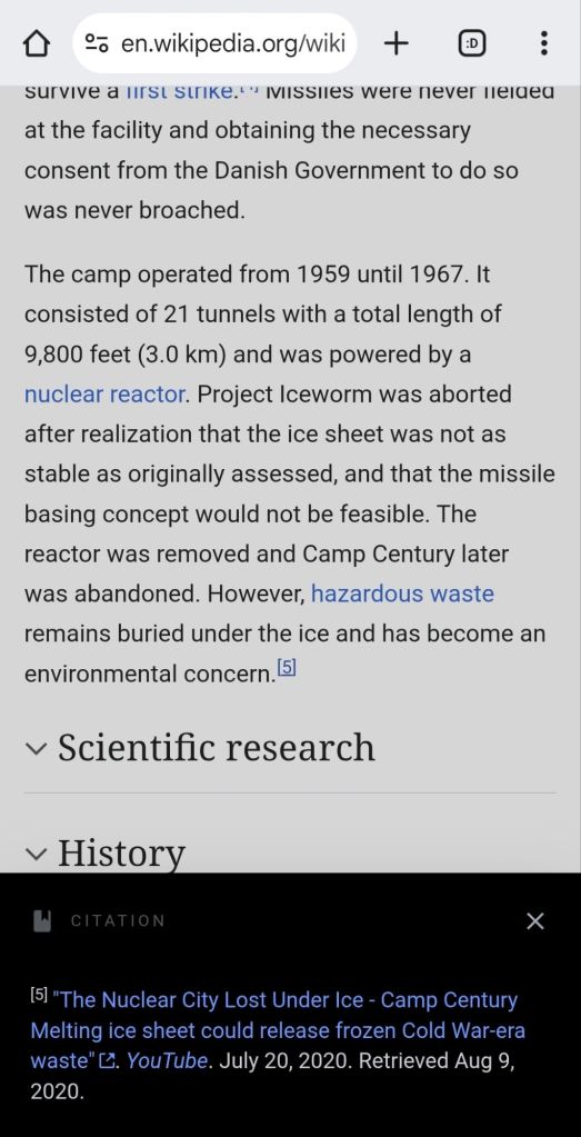 The following happened in Pituffik in 1957 : a nuclear reactor melted up and triggered the launch of a missile. The Iceworm project was a later attempt at cleaning everything from down under. There are lots of tunnels used by scientists around the world to measure “climate change” whatsoever the radioactivity (usually about 1000 CPM or about 10 uSv/h).
